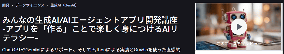 ChatGPTやGeminiといったAIツールを業務に役立てている人が増えています。これらのAIはAPI経由でも公開されており、APIを活用することで自分でチャットアプリや画像生成アプリを作ることができます。「みんなの生成AI/AIエージェントアプリ開発講座 -アプリを「作る」ことで楽しく身につけるAIリテラシー-」はOpenAIのAPIを用いてウェブアプリを作る手順を学べる講座で、初心者でもサクサク学べる構成になっています。