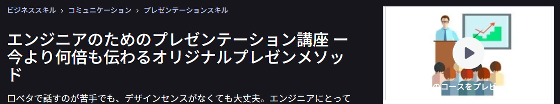 話すのが苦手な人を前提に解説が進み、緊張を和らげる方法や相手に聞こえやすい話し方も詳しく教えてくれます。1本の講座で「なぜプレゼンテーションが必要なのか」「プレゼンテーションは何を伝える場なのか」「プレゼンテーションの構築方法」「スライド資料作成のコツ」「話し方のコツ」「プレゼンテーション後のフォローアップ」まで網羅的に学べるため、口ベタな技術者のための入門講座としてかなりオススメできます。