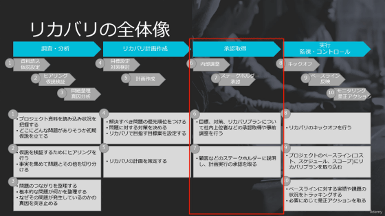 リカバリは「調査・分析」「リカバリ計画作成」「承認取得」「実行・監視・コントロール」の4段階に分けて実施します。