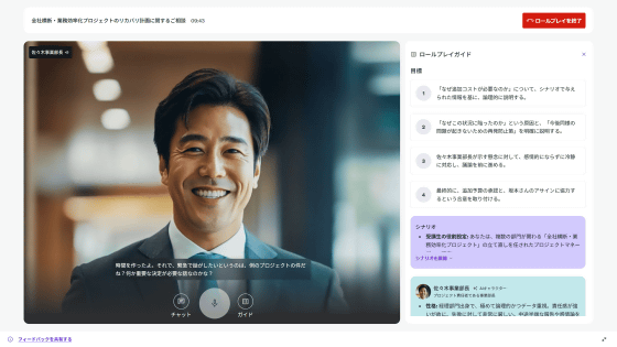 さらに、UdemyのAI機能を用いて「AI上司と音声で会話して、追加の予算をお願いする」というロールプレイも実行できます。AI上司はこちらの発言に合わせてリアルな応答を返してくるので、実際の炎上プロジェクトに取り組む前に腕試しができます。