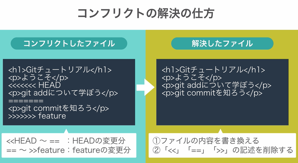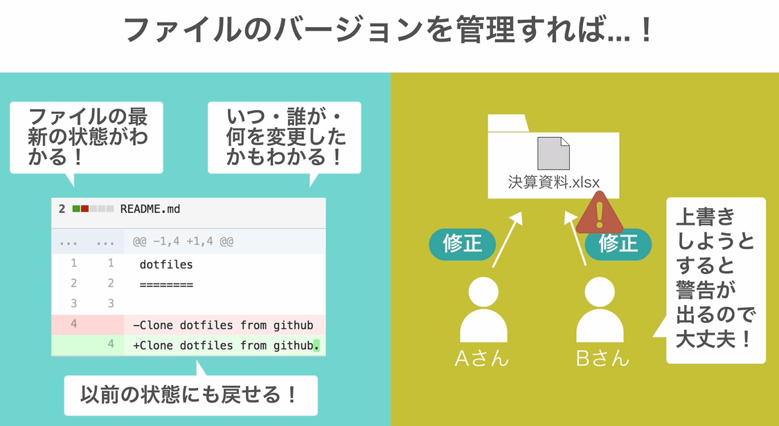 Gitはファイルの変更履歴を保存できるだけでなく、チームで作業している際に発生しがちな「同じファイルを同時に編集した結果、変更内容が衝突(コンフリクト)してしまった」という事態の解決にも役立ちます。