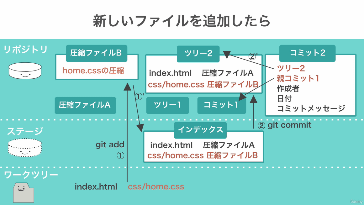 Gitを使って変更履歴を保存する際は「git add」と「git commit」という2つのコマンドの実行を求められます。初心者にとっては「保存操作のために2つのコマンドが必要になる」という複雑さがつまずきポイントになりがちですが、この講座では各コマンドの実行時に内部でどんなファイル操作が行われているのかを詳しく解説してくれるため、スッキリ理解できます。