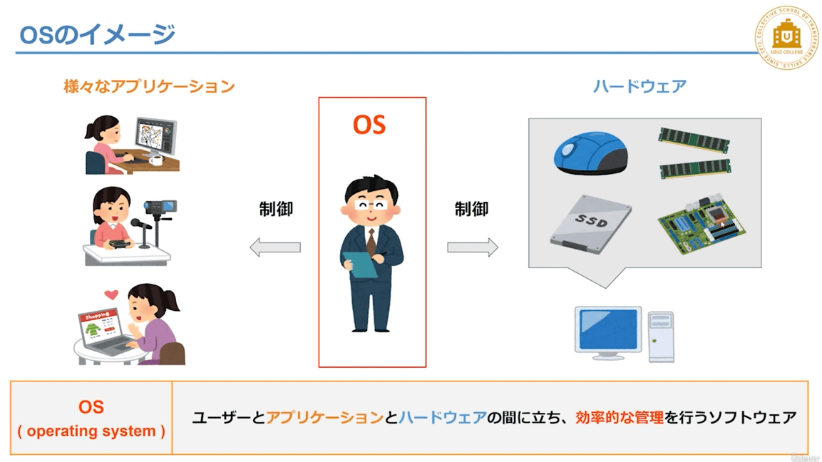 OSについて解説している場面を切り取ったものが以下。ほとんどの項目がイラスト付きで解説されており、複雑な内容も簡単な言葉で順番に説明してくれるので、スマートフォンしか触ったことがないレベルの人でも問題なく学習を進められます。