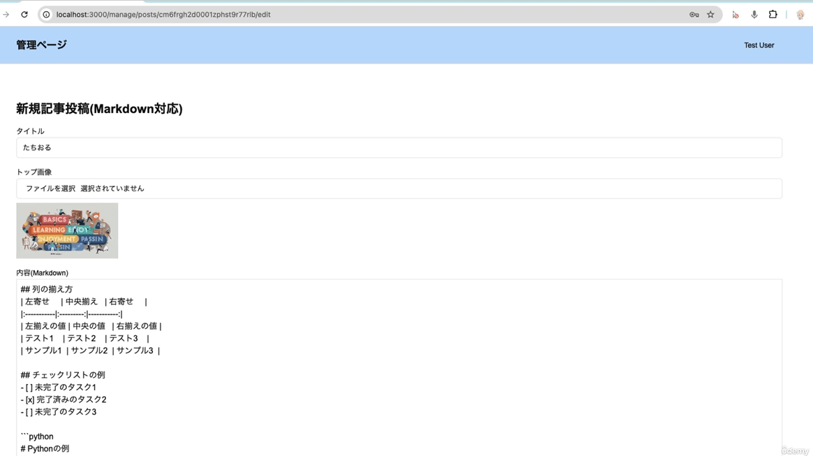 環境構築が完了したらNext.jsの仕様をじっくり学びます。講座の後半では学んだ内容を活用して「Markdownで記事を書けるブログ管理システム」をゼロから作るという実践的な課題に挑戦できます。