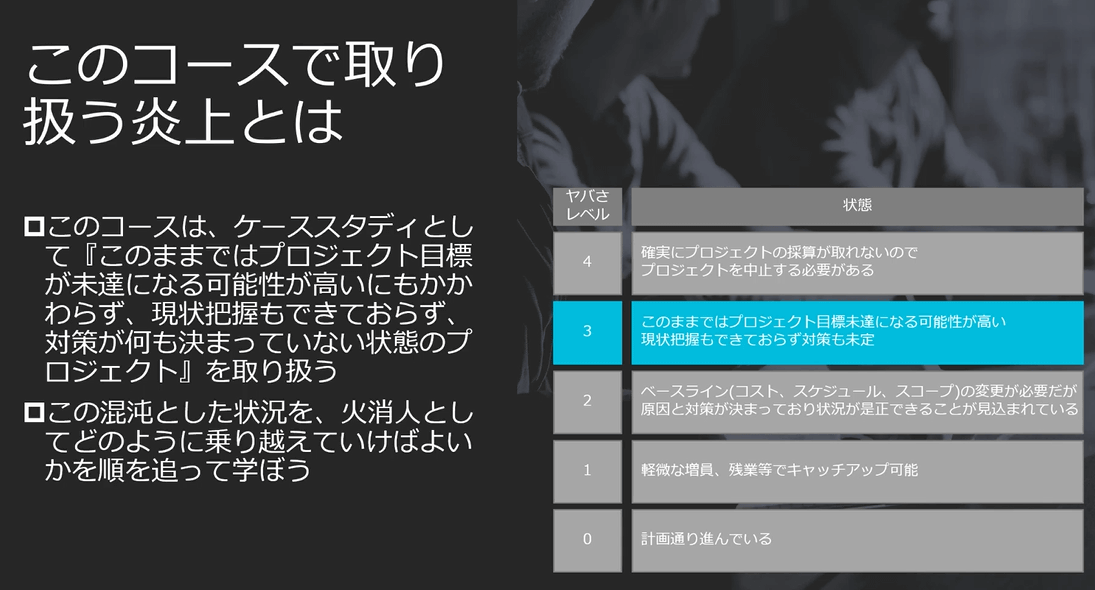 炎上プロジェクトごとに炎上の度合は異なります。この講座では「プロジェクト目標が未達になる可能性が高いにもかかわらず、現状把握ができておらず、対策が何も決まっていないプロジェクト」に火消し要員として投入された場合のリカバリ方法が解説されています。