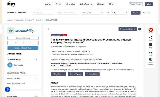 イギリスのウォーリック大学で材料工学助教を務めるニール・ラース氏は、「イギリスでは毎年数十万台のショッピングカートが放置されていると報告されています。それぞれを回収する際の二酸化炭素排出量を合計すると、その影響は甚大かつ懸念すべきものとなります」と指摘しています。