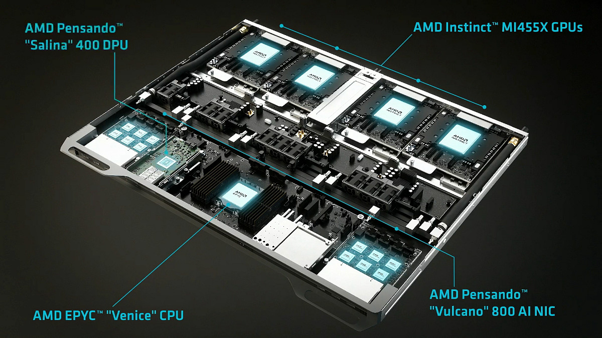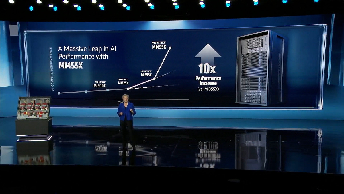 AIデータセンター向けのGPU「MI400シリーズ」も発表されました。上位モデルのMI455Xは前世代モデルのMI355Xと比べて性能が10倍に向上しています。