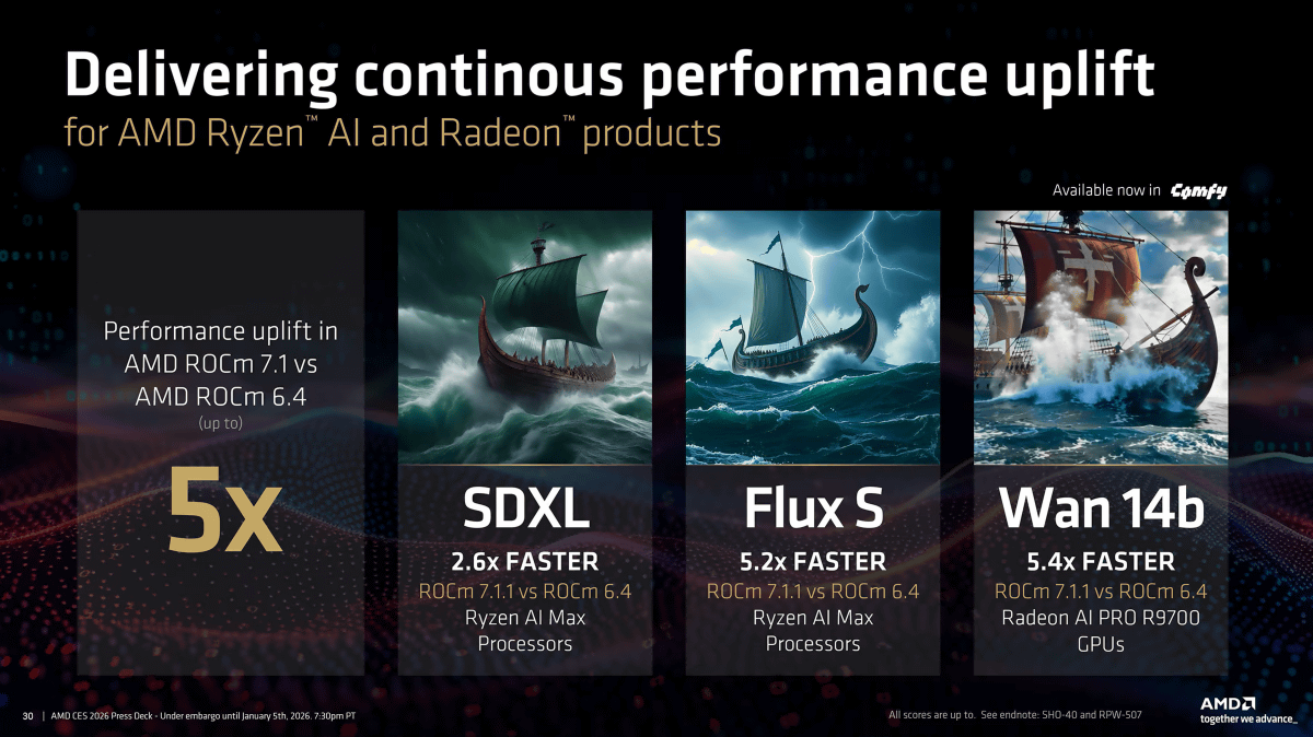 AMDはROCm 7.1.1を用いることでComfyUIでの生成処理を最大5.4倍高速化できるとアピールしています。ROCm 7.1.1での生成速度をROCm 6.4と比較すると、Stable Diffusion XL(SDXL)では2.6倍、FLUX.1 [schnell]では5.2倍、WAN 14bでは5.4倍になりました。