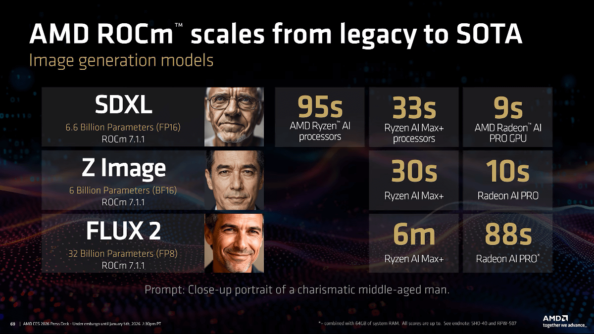 FP8版のFLUX.2で画像を生成する場合、Ryzen AI Max+では6分、Radeon AI PROでは88秒で画像を生成できるとのこと。
