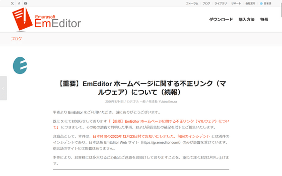 2026年1月4日にEmurasoftが発表したところによると、EmEditor公式サイトに存在するデスクトップインストーラー最新版(emed64_25.4.4.msi)のダウンロード先リンクが何者かによって改ざんされ、第三者のリンクに遷移するようになっていたとのこと。第三者のリンクにアクセスしたユーザーは、マルウェアを含む可能性のあるファイルをダウンロードしてしまった恐れがあるそうです。