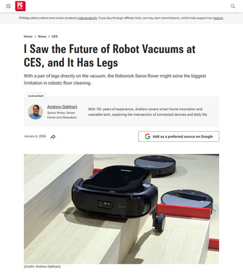 PCMagは「Roborock Saros Rover」について、「ロボット掃除機の未来を見た」と報道。PCMagは会場のデモンストレーションで「Roborock Saros Rover」が階段を上る様子を確認したそうですが、下りる様子は観ることができなかったそうです。PCMagによると、「Roborock Saros Rover」はモーションセンサーとAIで周囲の3D空間情報を処理する模様。