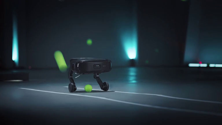 車輪脚を伸ばした状態で走行しながら、テニスボールをぶつけられまくる「Roborock Saros Rover」。車輪脚を伸ばした状態で走行しても、多少の衝撃はものともしないというわけ。