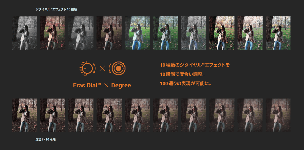 側面には「ジダイヤル」と名付けられたエフェクト切り替えダイヤルを搭載。エフェクトは35mmカラーネガフィルムをイメージした「1980」やスマホ向け写真加工アプリをイメージした「2010」など時代ごとの特徴的な手法を再現できるものがそろっています。