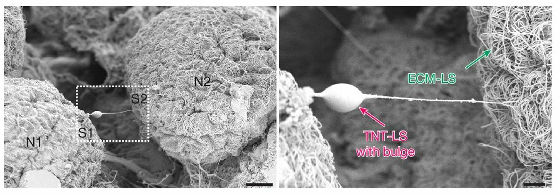 以下の画像は、実際にサテライトグリア細胞と神経線維の間に伸びるトンネルナノチューブを捉えたもの。チューブの途中に膨らんだ部分があり、何かが輸送されていることがわかります。