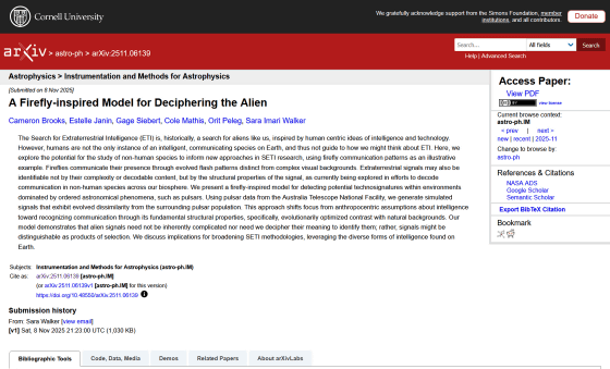 地球外文明を探し出す地球外知的生命体探査(SETI)は人類の夢ですが、高度な地球外文明は必ずしも人間のような方法でコミュニケーションしているとは限りません。2025年11月8日にプレプリントサーバーのarXivに掲載された論文では、「地球外文明はホタルのように光ることで通信している可能性がある」という仮説が提唱されました。