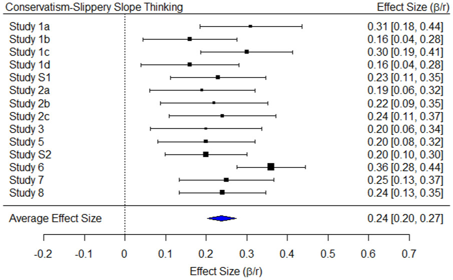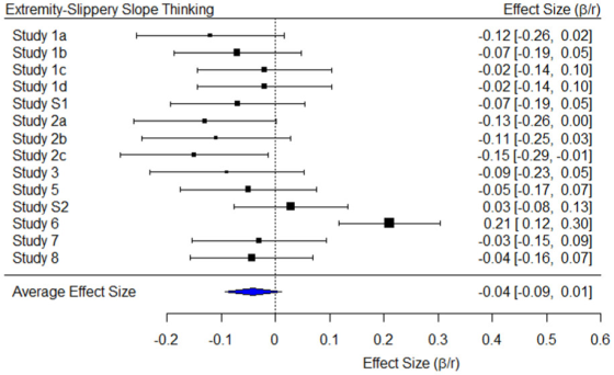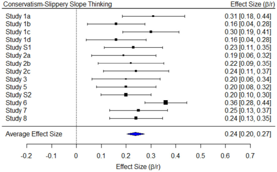 こうした傾向が一部の実験だけの偶然かどうかを確かめるため、研究チームは複数の研究を横断して結果をまとめています。その結果、研究ごとに多少のばらつきはあるものの多くの研究で「保守的であるほど滑り坂論法を支持しやすい」という傾向は一致しました。