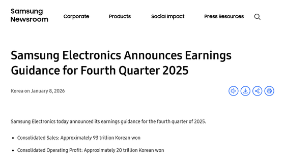 Samsung Electronicsの発表した2025年第4四半期業績見通しによると、売上はおよそ93兆ウォン(約10兆円)、営業利益はおよそ20兆ウォンだとのこと。