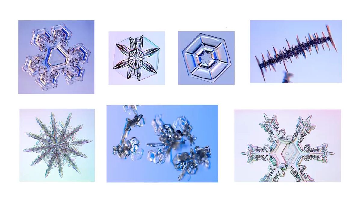 また、一般に「雪の結晶」と聞いて連想するのはこのような形かもしれませんが、実際には多種多様な形状があります。