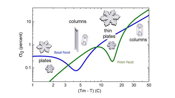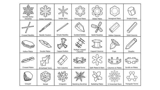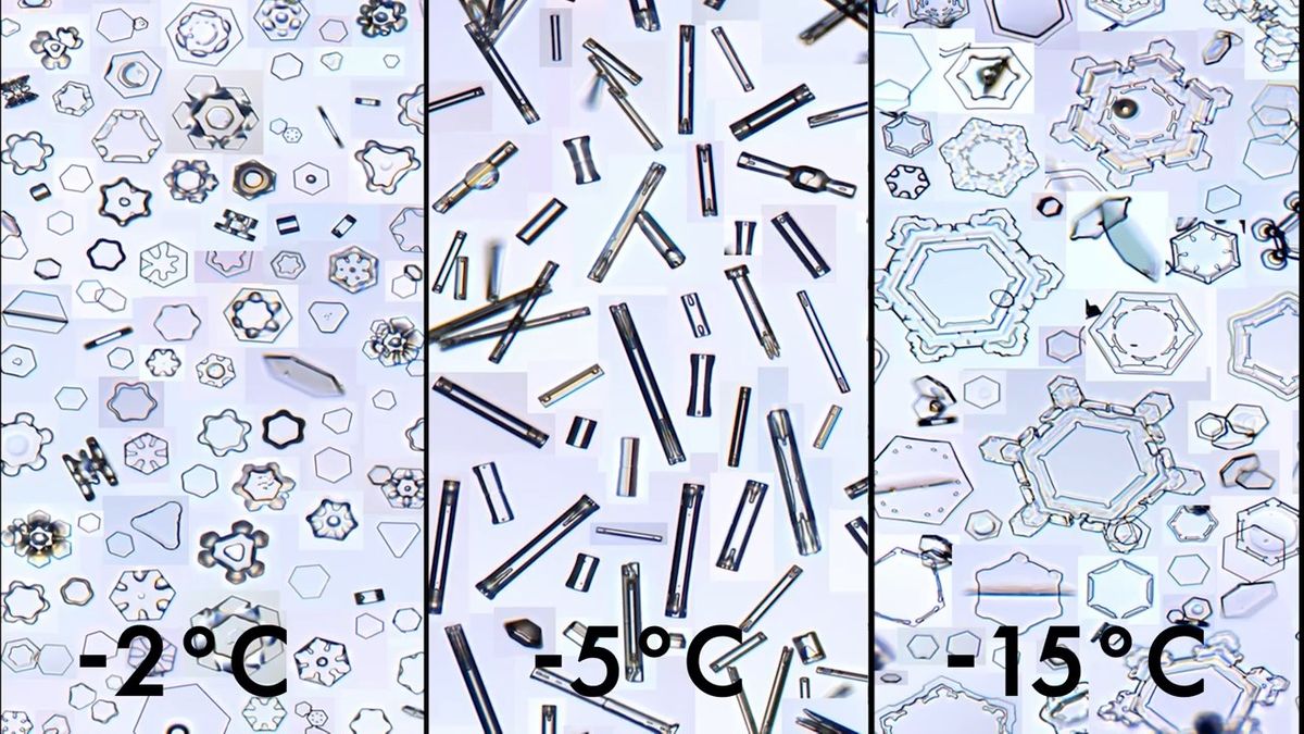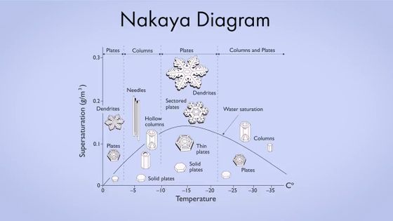 この法則はナカヤ・ダイヤグラムとしてまとめられています。まずマイナス2度付近でプレート状の結晶が作られ、マイナス5度を下回ると柱状や針状の結晶が形成されます。そしてマイナス15度からは再びプレート状の結晶になり、マイナス20度以下では柱状とプレート状の結晶がそれぞれ作られるとのこと。