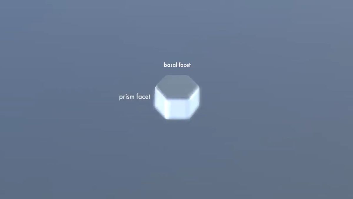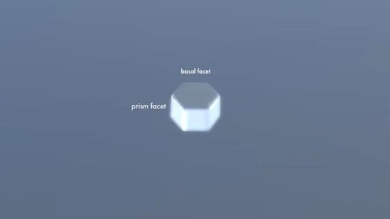 初期の雪の結晶は、このように平らな上面と底面(基底面)がある六角柱のような形状になります。