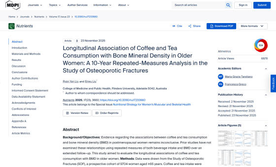 骨粗しょう症は骨密度の減少によって骨折しやすくなる病気で、特に高齢者はリスクが高いとされています。オーストラリアのフリンダース大学が行った研究では、「紅茶を飲むかコーヒーを飲むか」の選択が高齢女性の骨粗しょう症リスクと関連していることが示されました。