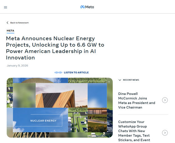 現地時間の2026年1月9日、Metaは原子力分野のRFPプロセスに従い、電力網へのクリーンかつ信頼性の高いエネルギーの供給、原子力発電所の稼働への継続的な投資の維持、原子力燃料サプライチェーン、アメリカの雇用、AIイノベーションの支援につながる3社と契約を締結したことを発表しました。Metaと契約を締結したのは、従来の原子炉よりも小さい小型モジュール炉を開発するOklo、次世代型原子炉の研究開発を行うTerraPower、アメリカ最大の競争力のある発電事業者であるVistraの3社です。