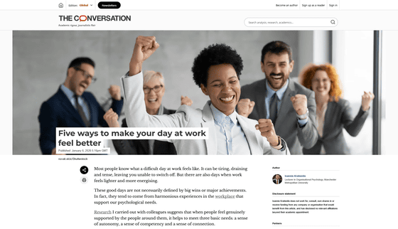 過去の研究から、人々は「自立心」「達成感」「帰属意識」の3つの心理的欲求が満たされると、その他の欲求とは無関係に幸福感にポジティブな効果が得られることがわかっています。マンチェスター・メトロポリタン大学で組織心理学の講師を務めるイオアニス・クラツィオティス氏は、自分にとっても周囲の人々にとっても職場で気分のいい1日を過ごすための5つの提案を行っています。