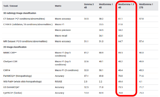 MedGemma 1.5 4Bと各種モデルのベンチマークスコアを並べた表が以下。MedGemma 1.5 4Bは汎用モデルのGemma 3 4Bや前世代モデルのMedGemma 1 4Bと比べて高いスコアを記録しているほか、一部のテストでは規模の大きなMedGemma 1 27Bを上回っています。