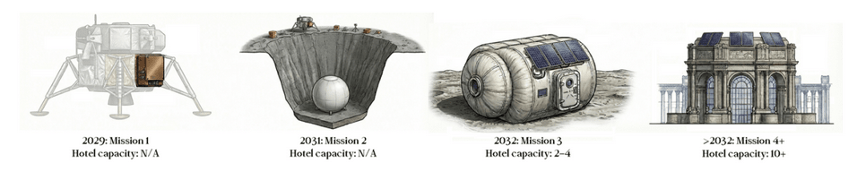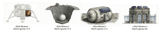 GRU Spaceのロードマップによると、2029年にはNASAの商業月面ペイロードサービス(CLPS)を利用して初の月面ミッションの達成を目指しており、月面でのホテル建設に必要な材料を実証する予定とのこと。その次のミッションでより大型のペイロードを打ち上げ、2032年に予定している3回目のミッションで初期のホテルを建設。その後、初期の宿泊客を受け入れる予定です。このホテルは一度に4人のゲストを収容できる大きさです。