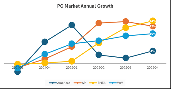 世界のPC出荷台数が2025年第4四半期に前年同期比9.6%増、Windows 10サポート終了によるアップグレードや値上げ前の確保需要