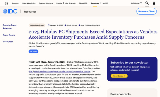 数字の伸びの要因として、IDCはWindows 10のサポート終了に伴うアップグレート需要、2026年からの関税への懸念からベンダーが計画よりも在庫処理を繰り上げたこと、メモリ不足の顕在化による値上げに先立つバイヤーやブランドによる確保需要などを挙げています。