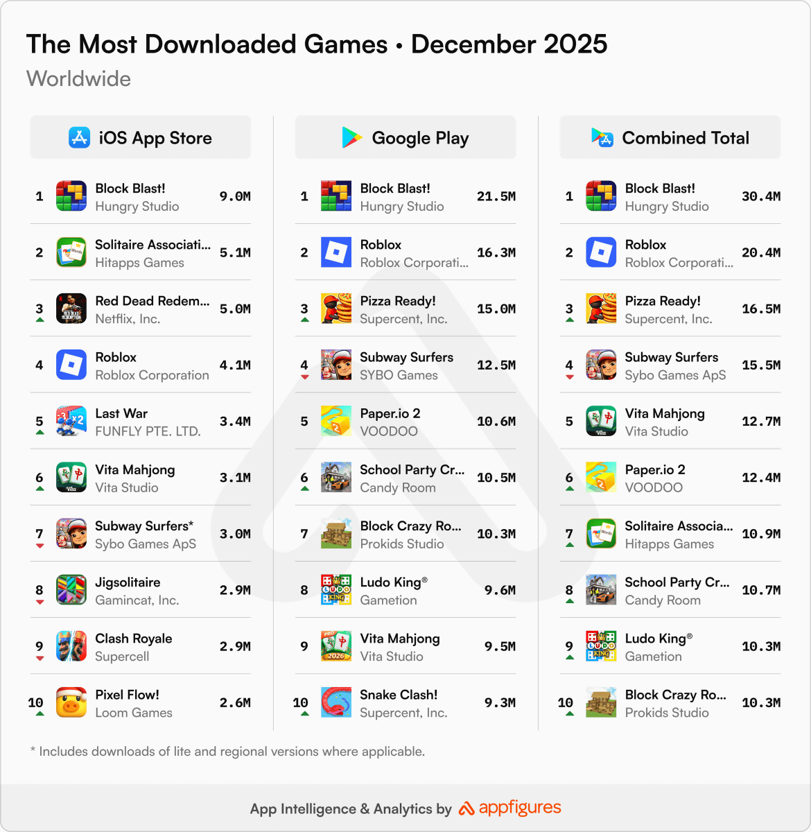2025年12月に全世界で最もダウンロードされたゲームアプリはテトリス風のパズルゲーム「Block Blast」で、App StoreとGoogle Playで合計3040万回ダウンロードされました。また、App SotreではNetflixの加入者向けに無料リリースされたレッド・デッド・リデンプションのスマートフォン版が500万回ダウンロードされて3位にランクインしています。