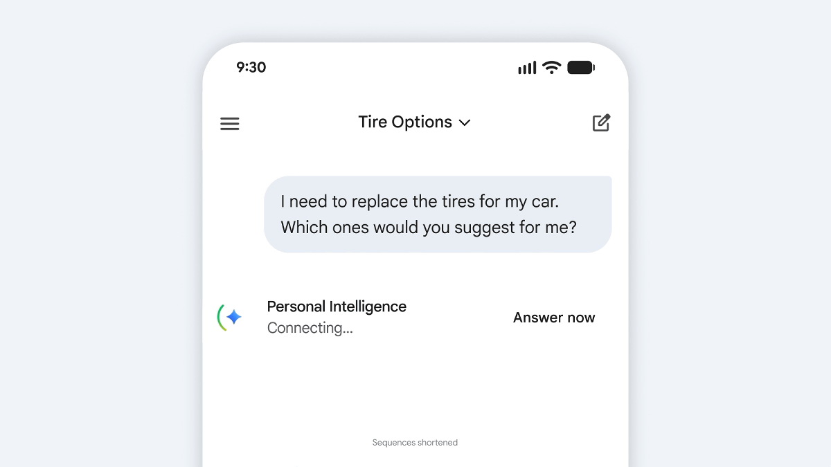 Personal Intelligenceの活用例が以下。まず、「車のタイヤを交換するからオススメを教えて」と指示します。