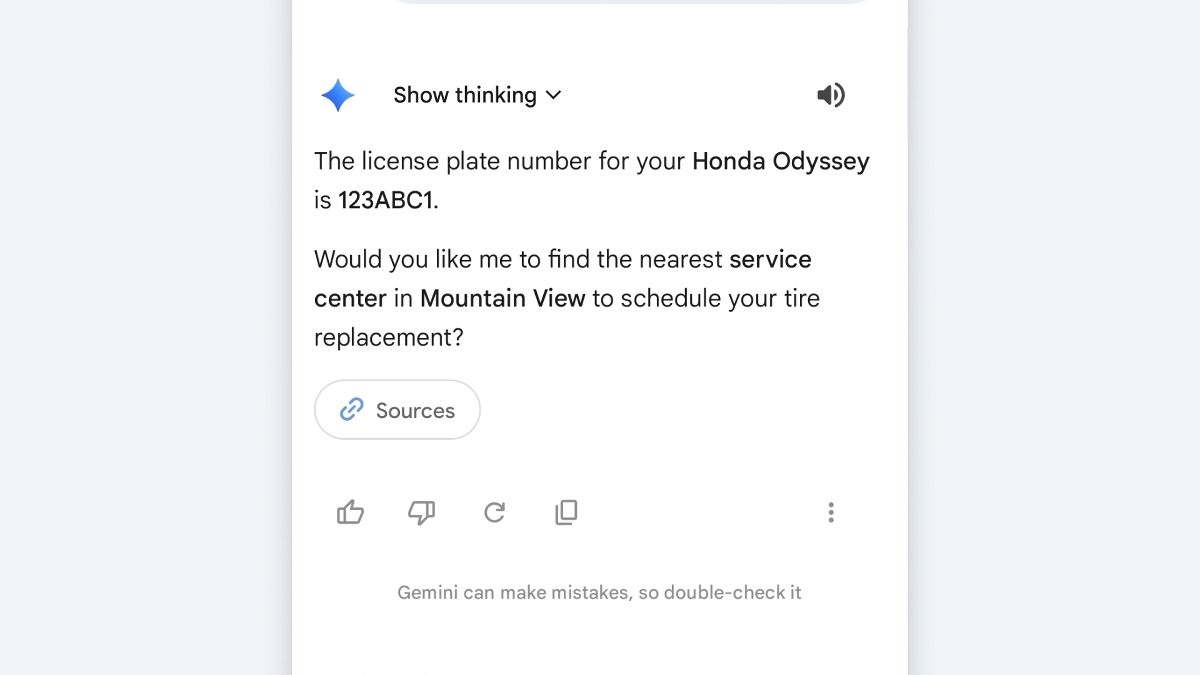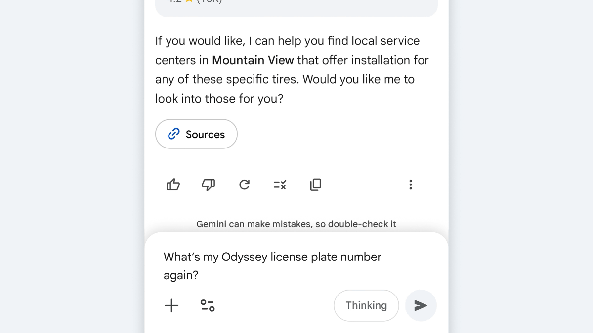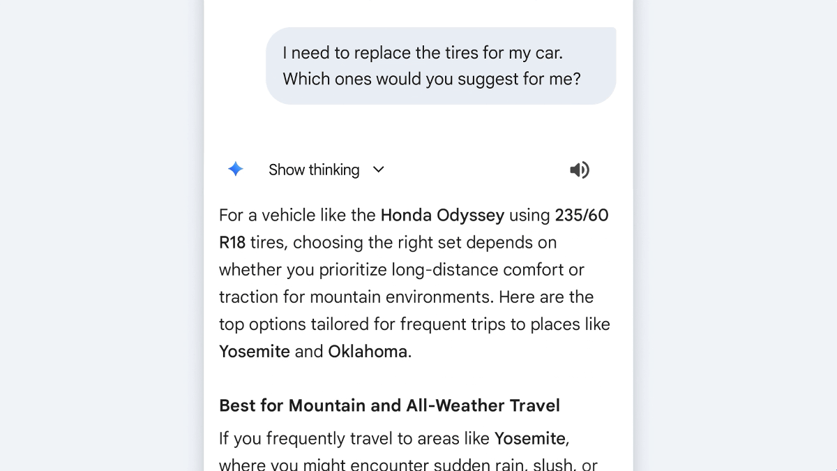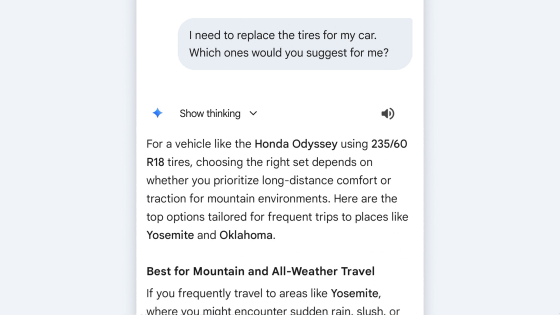 すると、Googleフォトなどの情報をもとに「ホンダのオデッセイに乗っている」「自然公園などに旅行に行くことが多い」といったことを認識し、オデッセイ用の全天候型タイヤをオススメしてくれました。