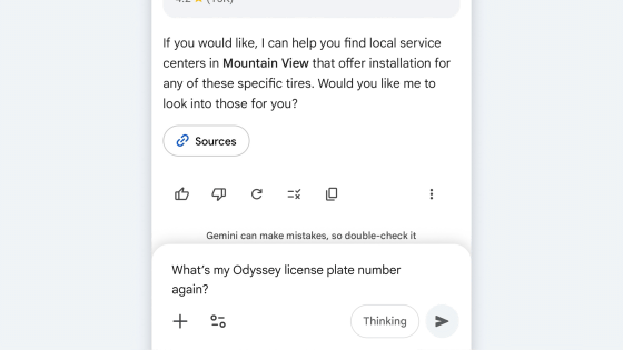 Geminiがナンバーを正確に教えてくれました。素のGeminiでは「ユーザーが所有している車」や「車のナンバープレート」といった情報を特定できませんが、Personal Intelligenceを使ってGoogleフォトなどの情報を読み込ませることで個人的な情報に基づく回答が可能となります。