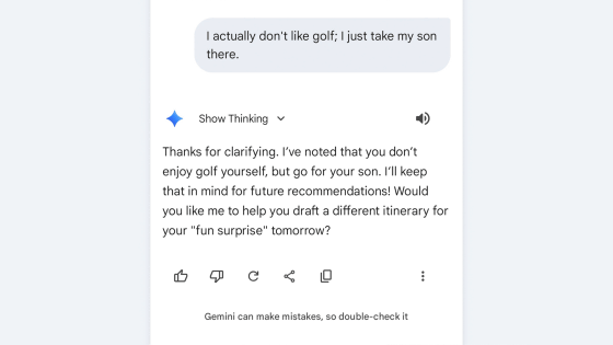 ただし、Personal Intelligenceはユーザーの情報を誤って認識してしまうこともあります。例えば「自分はゴルフが好きじゃないけど、息子のためにゴルフ場に通っている」という場合でもGoogleフォトなどの情報をもとに「このユーザーはゴルフが好き」と認識してしまいます。この場合、Geminiに対して「私はゴルフが好きではありません。息子を連れて行っているだけです」などと説明することでGeminiの認識を更新することができます。
