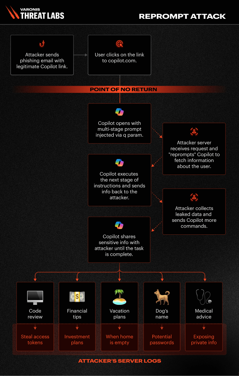 今回Varonis Threat Labsが発見した脆弱性「Reprompt」は、URLリンクをたった1回クリックするだけで機密データを盗み出せる攻撃手法です。プラグインやユーザーによる操作は一切不要であり、ユーザーがURLのクリック後にCopilotとのチャットを閉じても動作するほか、データ侵害を防ぐためにMicrosoftが設けた組み込みメカニズムも回避できるとのこと。