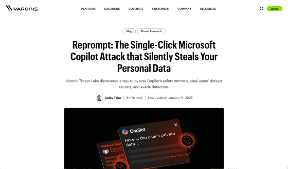 MicrosoftのAIアシスタントである「Copilot」はさまざまな事柄について質問したり、会話したり、画像を生成させたり、資料を作らせたりすることが可能です。そんなCopilotに、URLリンクを1回クリックするだけでさまざまな機密データが盗まれる脆弱(ぜいじゃく)性があることを、セキュリティ企業・Varonisの研究機関であるVaronis Threat Labsが発見しました。