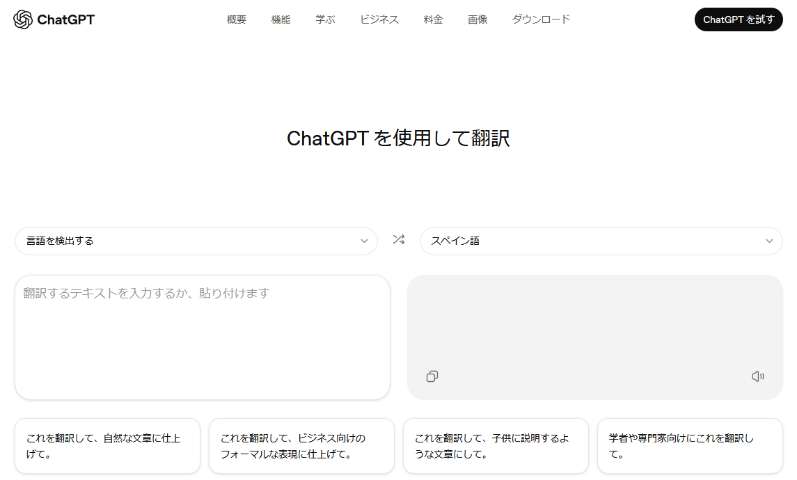 上記のリンクをクリックしてChatGPT Translateにアクセスすると、Google翻訳やDeepLなどの翻訳サイトに似た画面が表示されます。左側の入力欄にテキストを入力すると右側に翻訳結果が表示される仕組みです。