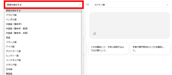 記事作成時点で選択可能な言語は以下の通り。入力言語を自動で検出することもできます。