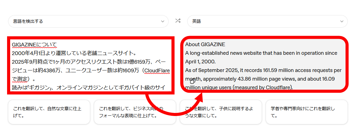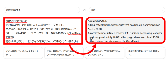 試しにGIGAZINEのaboutページを英語に翻訳してみたところ、正確に翻訳してくれました。