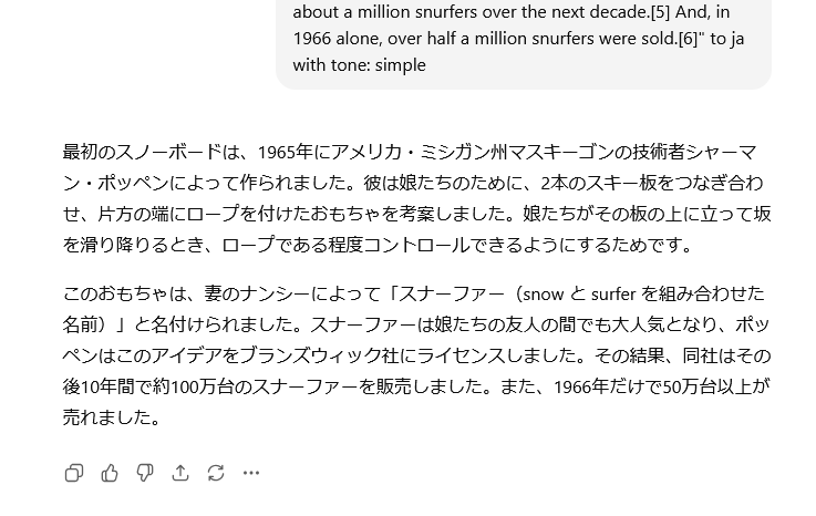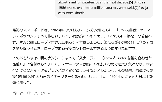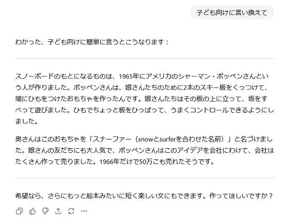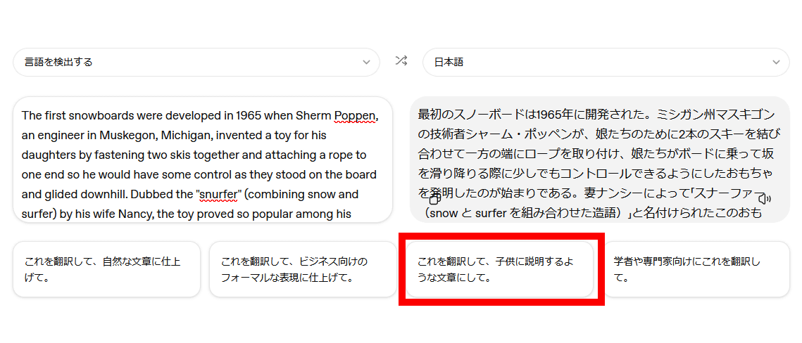 英語版Wikipediaのスノーボードのページも正確に和訳できました。下部には「自然な文章に翻訳」「ビジネス文書に翻訳」「子ども向けに翻訳」「専門家向けに翻訳」という機能を持ったボタンが並んでいるので、試しに「これを翻訳し、子どもに説明するような文章にして。」というボタンをクリックしてみました。