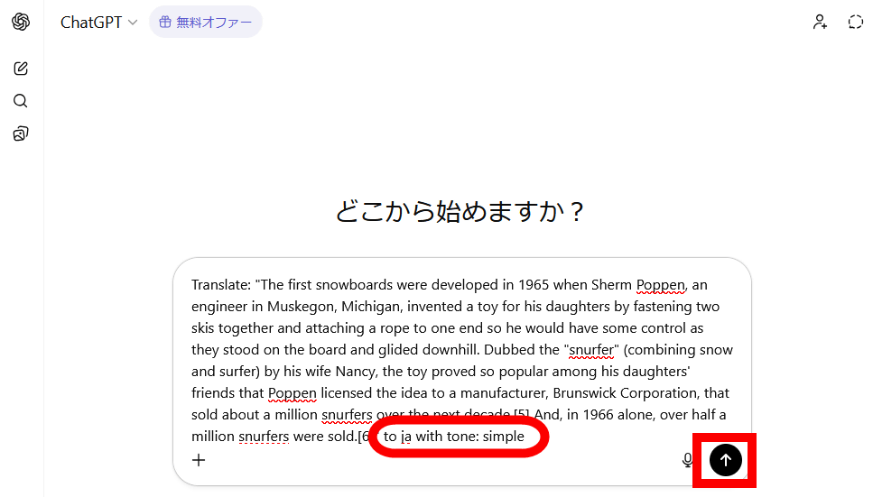 するとChatGPTが開きました。入力欄に翻訳前のテキストとともに「to ja with tone:simple(シンプルな日本語に翻訳)」というプロンプトが自動入力されていたので送信ボタンをクリックします。