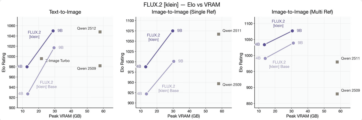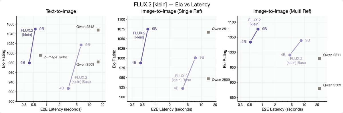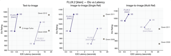 以下は、画像の生成品質を示すEloスコア(縦軸)と処理時間を示すレイテンシ(横軸)をグラフに表したもの。テキストから画像を生成する Text-to-Image、1枚の参照画像を使うImage-to-Image、複数の参照画像を用いるMulti-Referenceの各タスクにおいて、Alibabaの画像生成AIモデル「Qwen-Image-2512」と同等またはそれ以上のEloスコアを、はるかに低いレイテンシでFLUX.2[klein]が実現していることが示されています。