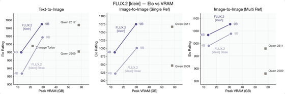 また以下は、縦軸がEloスコア、横軸がVRAM使用量を示したグラフ。FLUX.2[klein]はここでも、Qwen-Image-2512やQwen-Image-2509と比較して同等以上のEloスコアをはるかに少ないVRAM使用量で実現しています。特に複数の参照画像を用いるMulti-Referenceのタスクでは、VRAM使用量を大幅に削減しながら画像の品質もかなり高くなっていることがわかります。