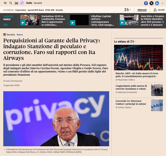 Perquisizioni al Garante della Privacy: indagato Stanzione di peculato e corruzione. Faro sui rapporti con Ita Airways - Il Sole 24 ORE