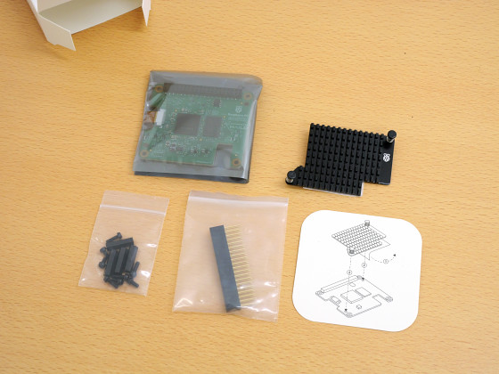 箱の中にはRaspberry Pi AI HAT+ 2本体、ヒートシンク、ネジ、スペーサー、ピンヘッダー、取り付けガイドが入っていました。