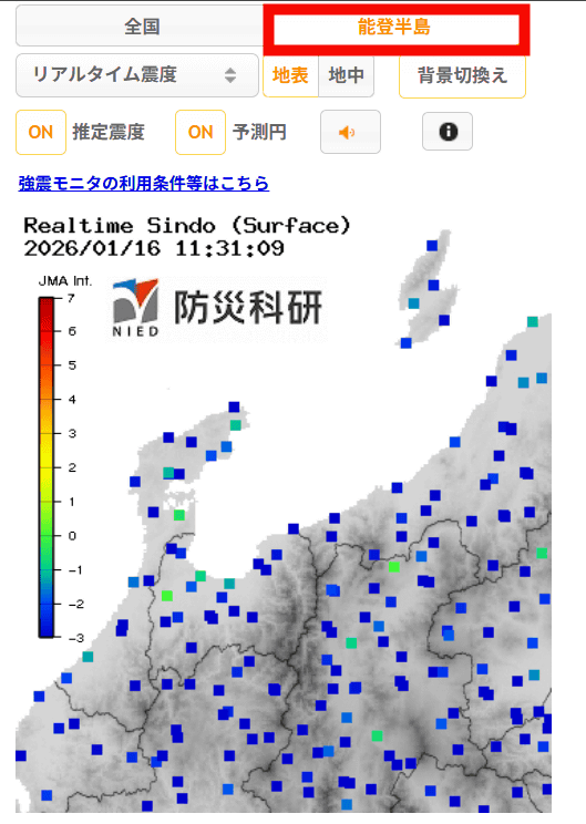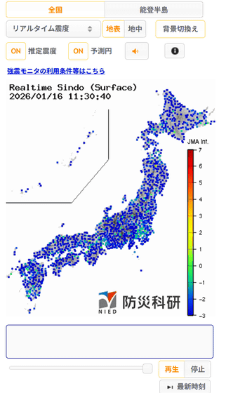 リアルタイムに日本全国の地震の揺れを表示する「強震モニタ」