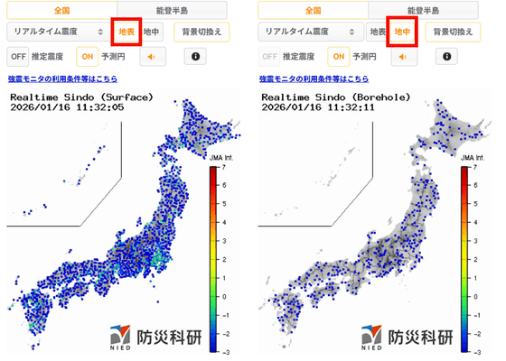 文部科学省管轄の国立研究開発法人である防災科学技術研究所が公開している「強震モニタ」は、日本全国でリアルタイムに発生している地震の揺れを1秒間隔で細かく見ることができます。