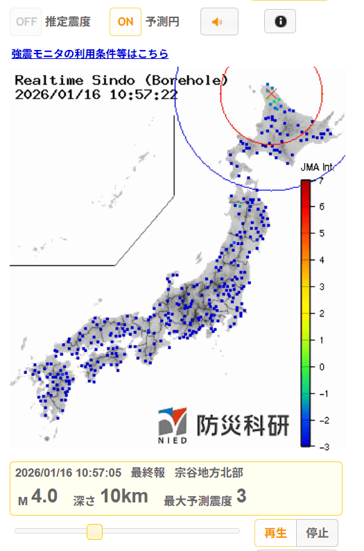 時間をさかのぼってデータを確認していたところ、2026年1月16日10時57分に北海道の宗谷地方北部で発生した地震の情報が表示されました。地震が発生した場合地図の下のエリアに情報が表示され、この地震の場合はマグニチュード4.0、震源の深さ10km、最大予測震度は3とのことでした。また、地図上には地震がどれくらい広がっていくかという「予測円」が表示されています。